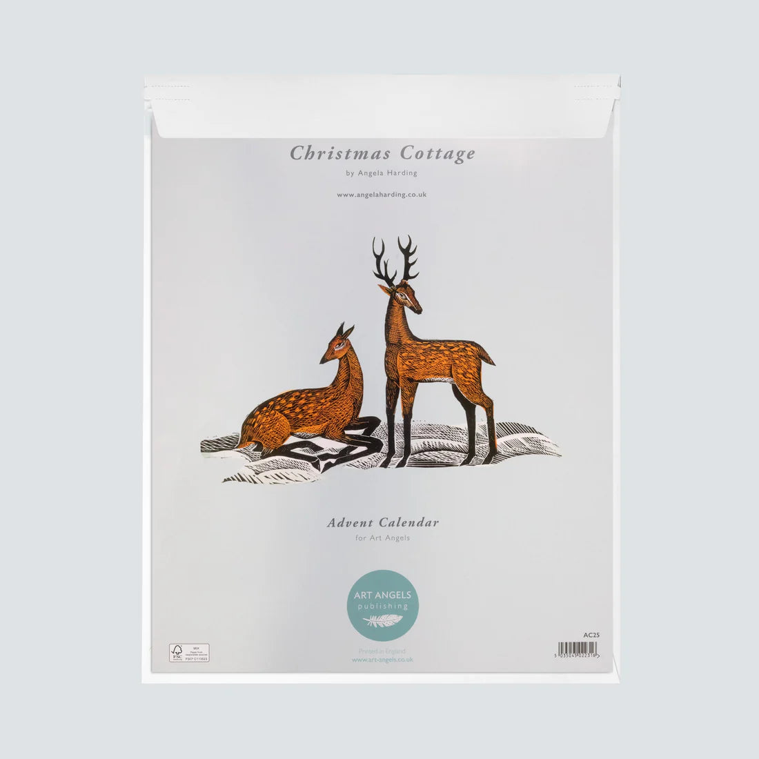 A beautiful free standing illustrated, 3D advent calendar, depicting a traditional winter scene Christmas Cottage by Angela Harding and featuring two free standing whippets. Take great delight opening the numbered advent doors in the countdown to Christmas and discover a seasonal image underneath to fill you full of festive joy.