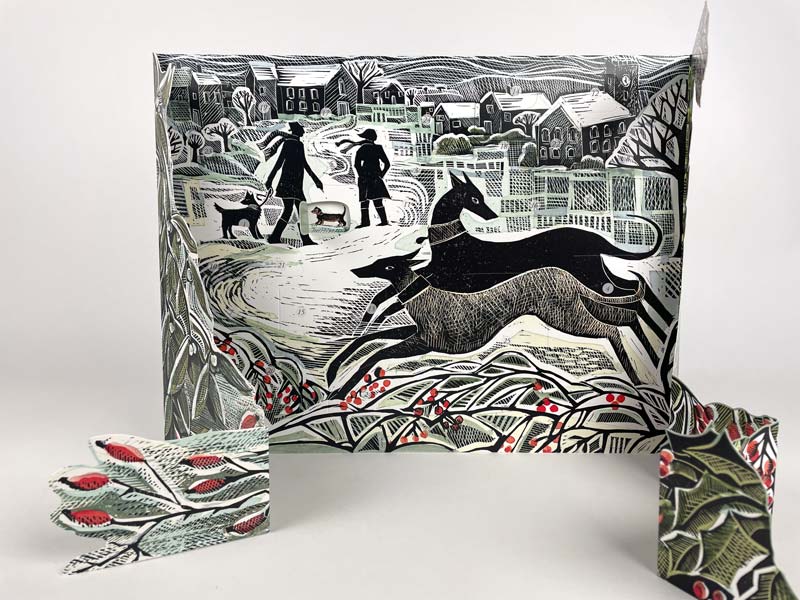 A beautiful free standing illustrated, 3D advent calendar, depicting a traditional winter scene Whippet Wonderland by Angela Harding. Take great delight opening the numbered advent doors in the countdown to Christmas and discover a seasonal image underneath to fill you full of festive joy.