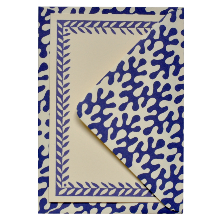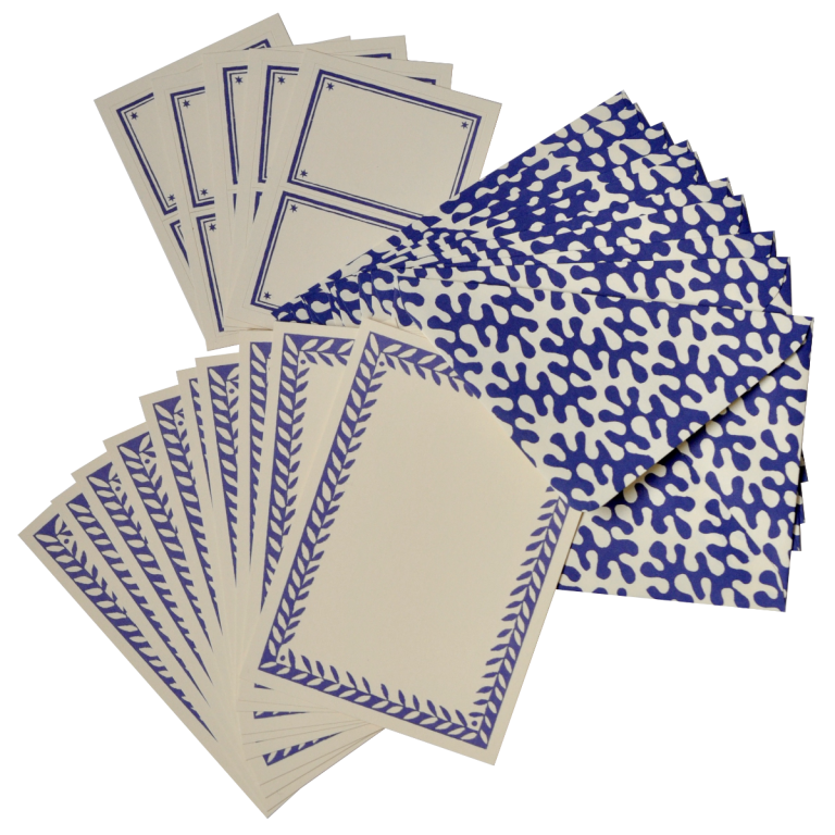 A set of ten Notecards with a patterned border, with matching patterned envelopes and address labels. The Patterned Envelopes are traditional diamond flap envelopes with a water-soluble gummed strip to seal. The Address Labels are self-adhesive.