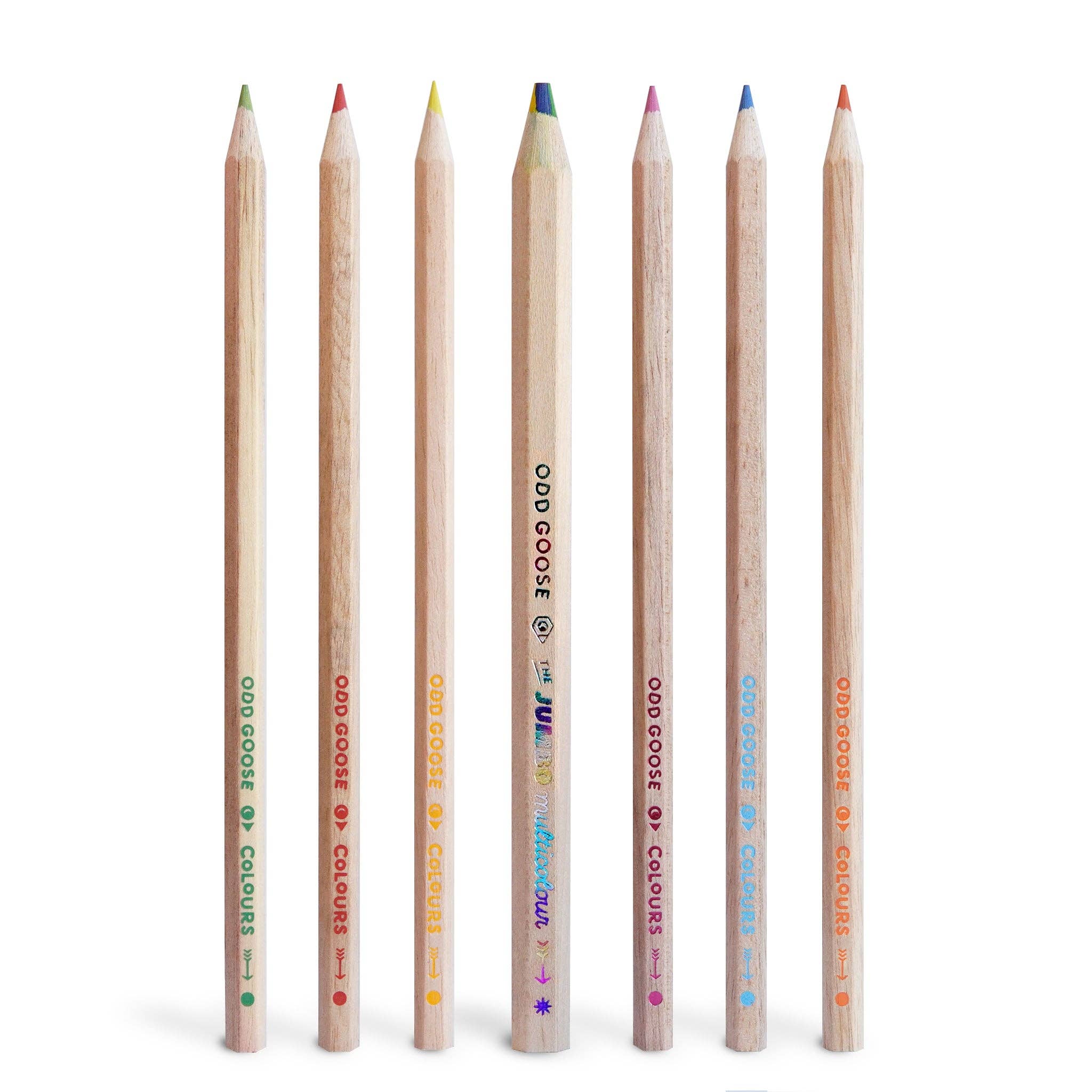 Odd Goose Colours colouring pencil set has a funky style and a sustainable story to tell. First, the classic four-in-one Jumbo Multicolour pencil built in Germany and rainbow foil-printed by Odd Goose in the UK. Next, six rich shades come in FSC-certified pulai wood which is specially grown through a government-backed initiative to produce sustainable timber and protect the Indonesian rainforest. Pulai has a long history of use in school blackboards and its natural shade variation give each