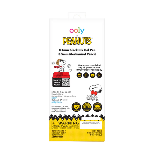Write, doodle, and dream big with the OOLY x Peanuts Gel Pen & Mechanical Pencil Set! This fun combo features a smooth black gel ink Charlie Brown gel pen and a mechanical (and refillable!) Snoopy mechanical pencil, both topped with acrylic character clips. Perfect for jotting down notes, sketching Snoopy’s escapades, or tackling schoolwork, this set brings a touch of Peanuts fun to any task. Ideal for Peanuts fans of all ages, it’s the perfect pen and pencil set for school, journaling, or just having fun with your favourite characters!